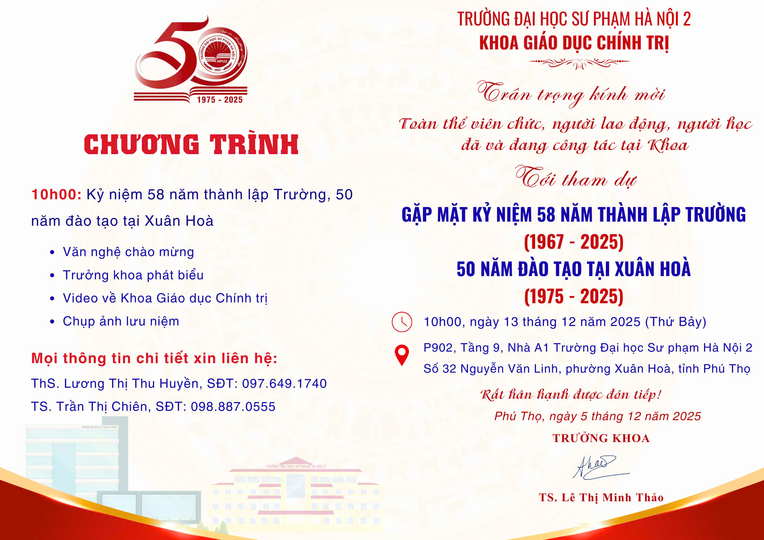 Khoa Giáo dục chính trị trân trọng kính mời Toàn thể viên chức, người lao động, người học đã và đang công tác, học tập tại Khoa Giáo dục chính trị tới tham dự chương trình "Gặp mặt kỷ niệm 58 năm thành lập Trường và 50 năm đào tạo tại Xuân Hòa"